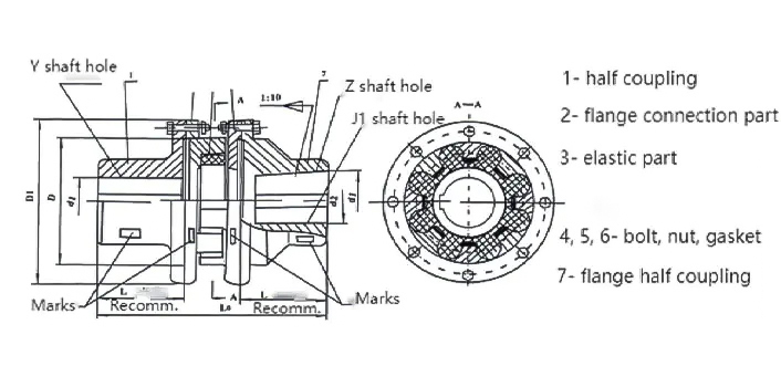Temel Bileşenler: Esas olarak çıkıntılı pençelere sahip iki flanşlı yarı birleştiriciden, flanş bağlantı parçalarından, erik şeklindeki elastik elemanlardan, cıvatalardan, somunlardan ve rondelalardan vb. oluşur. Erik şeklindeki elastik elemanlar, iki yarı birleştiricinin çıkıntılı pençeleri arasına yerleştirilir. iki yarı birleştiricinin bağlantısı.